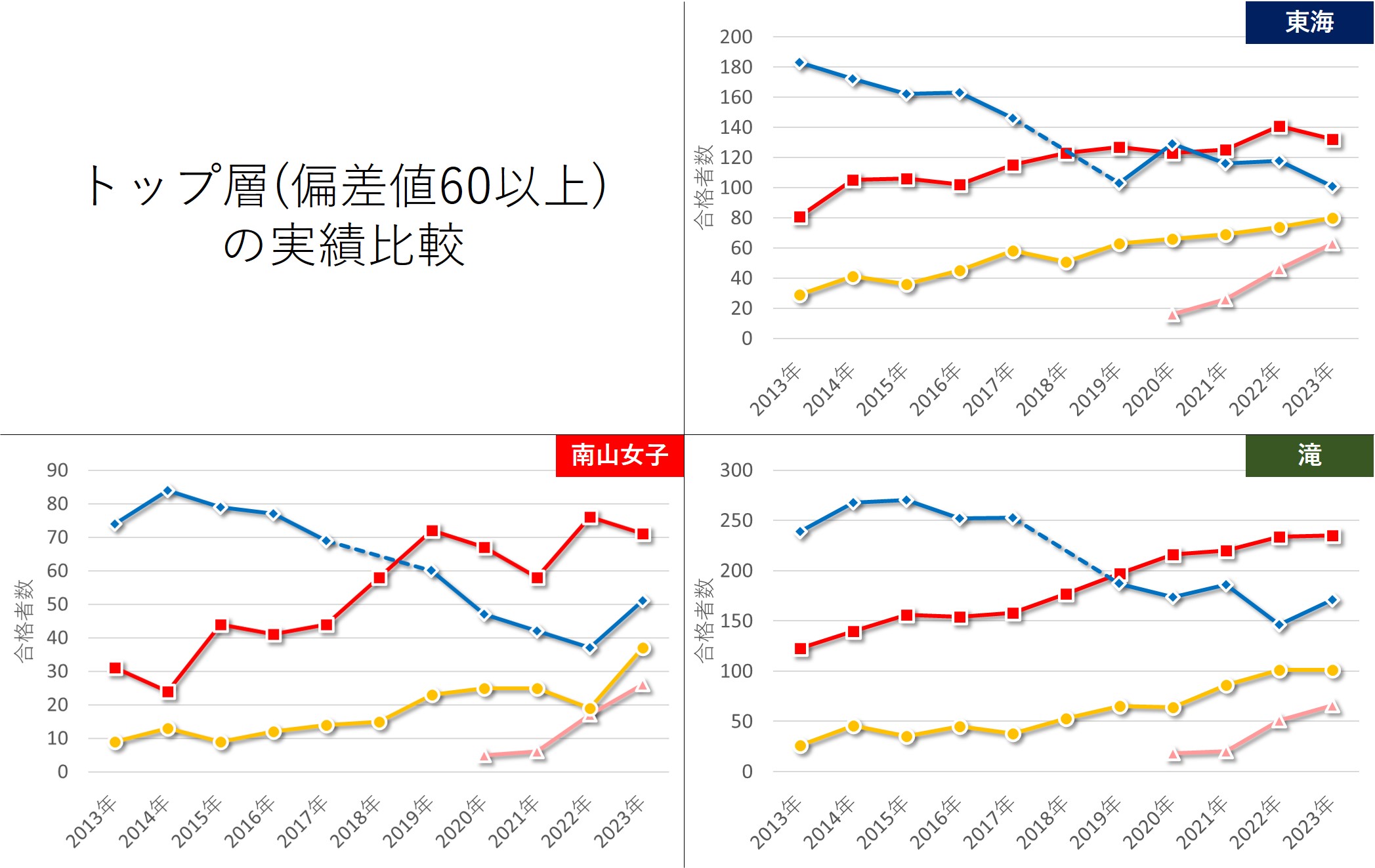 東海地区のトップ層である、南山女子、東海、滝の結果を並べると以下のようになります。