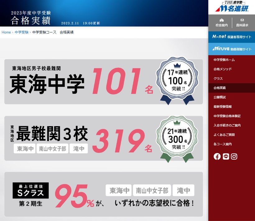 何より、Sクラス認定が取れていれば、南山女子、東海、滝のどこかに合格する可能性が95%というのはやはり強く、トップ層を狙う家庭にとってはこの要素だけで塾決定の決定的な理由になり得るのではないでしょうか。