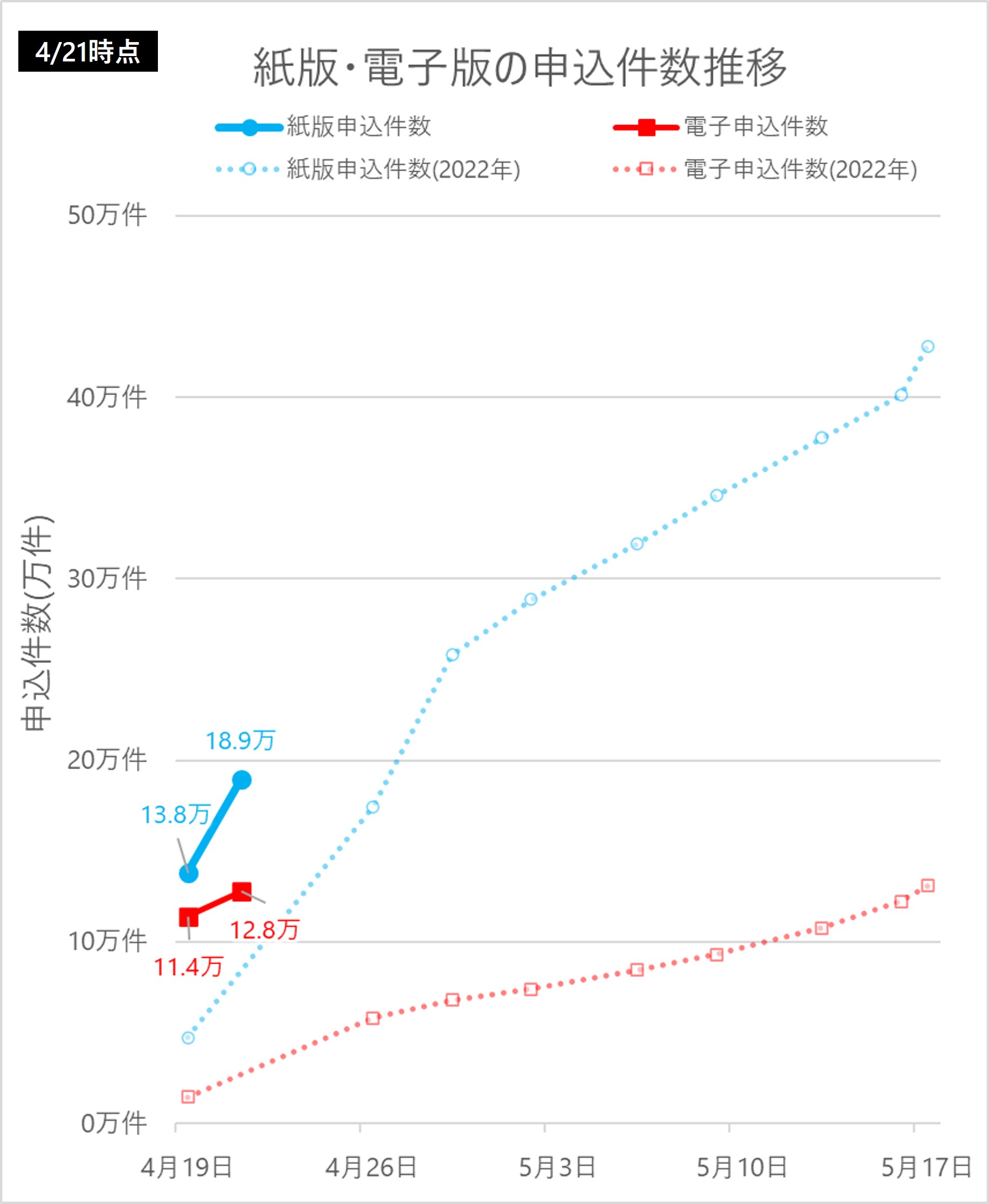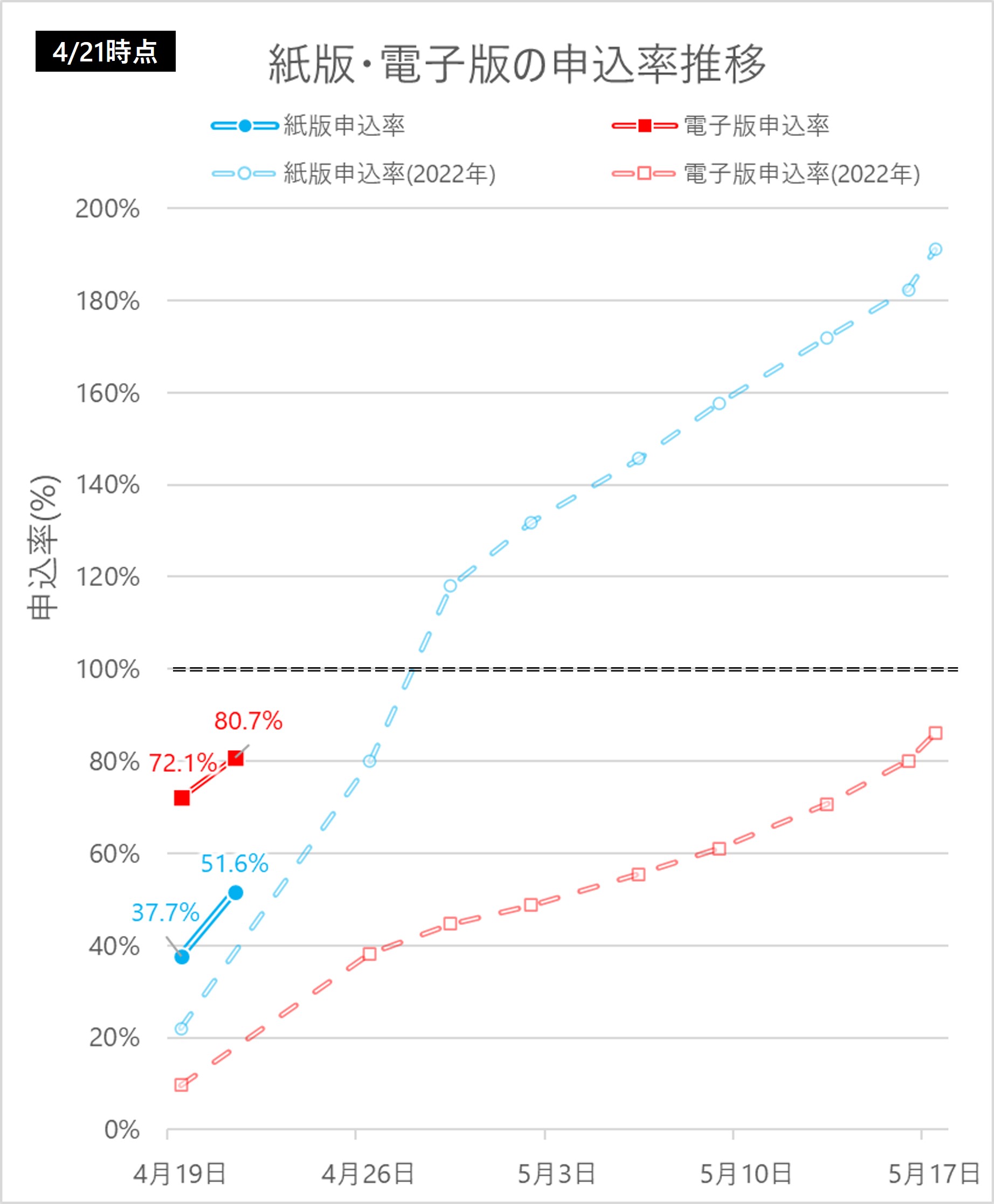 しかし、発行数が増えた関係で申込率の1日あたりの伸びは紙版は去年よりも鈍化していますが、増加数の少なかった電子版は去年よりも高く、