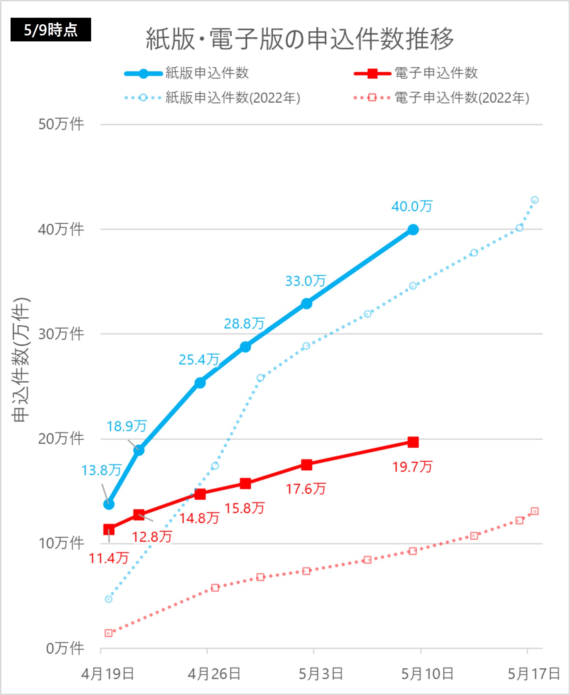 紙版は絶対数は異なるものの、1日あたりの申込み人数の増加数は去年よりも多い一方で、電子版は昨年と比較すると申し込む人の増加数はほぼ同等、といった感じです。