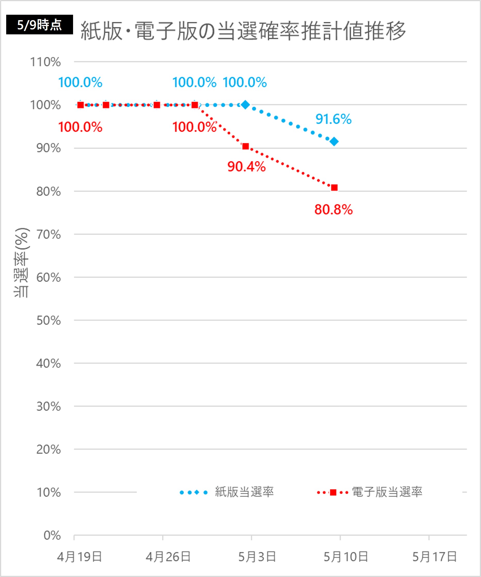 5月9日時点のプレミアム商品券の当選確率は紙版91.6%、電子版80.8%です。