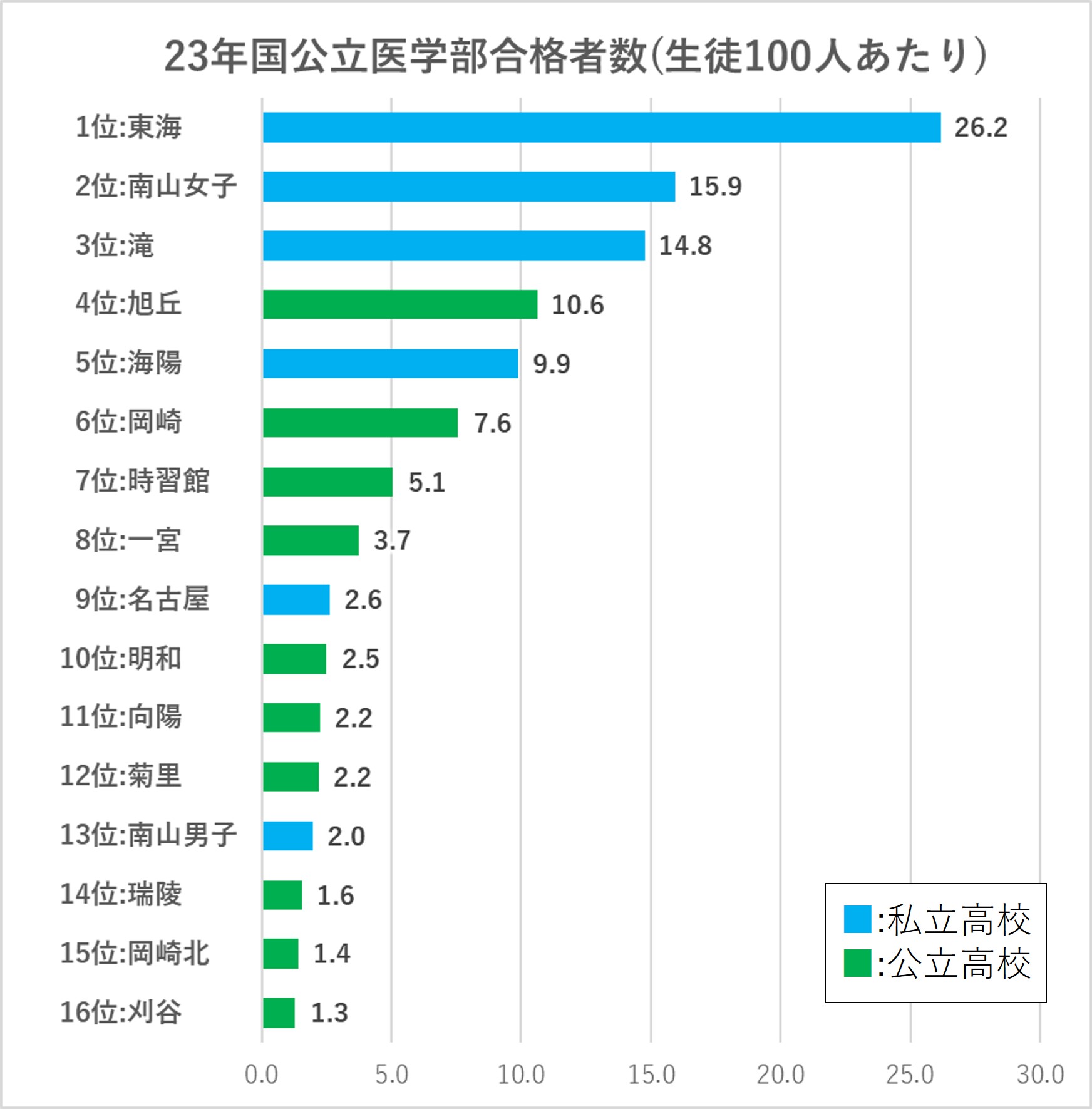 よく、東海高校は「全国1位の国公立医学部合格者数である」という記事を見ますが、生徒数も多い学校なので、生徒100人あたりに換算すると6位、という結果になりました。