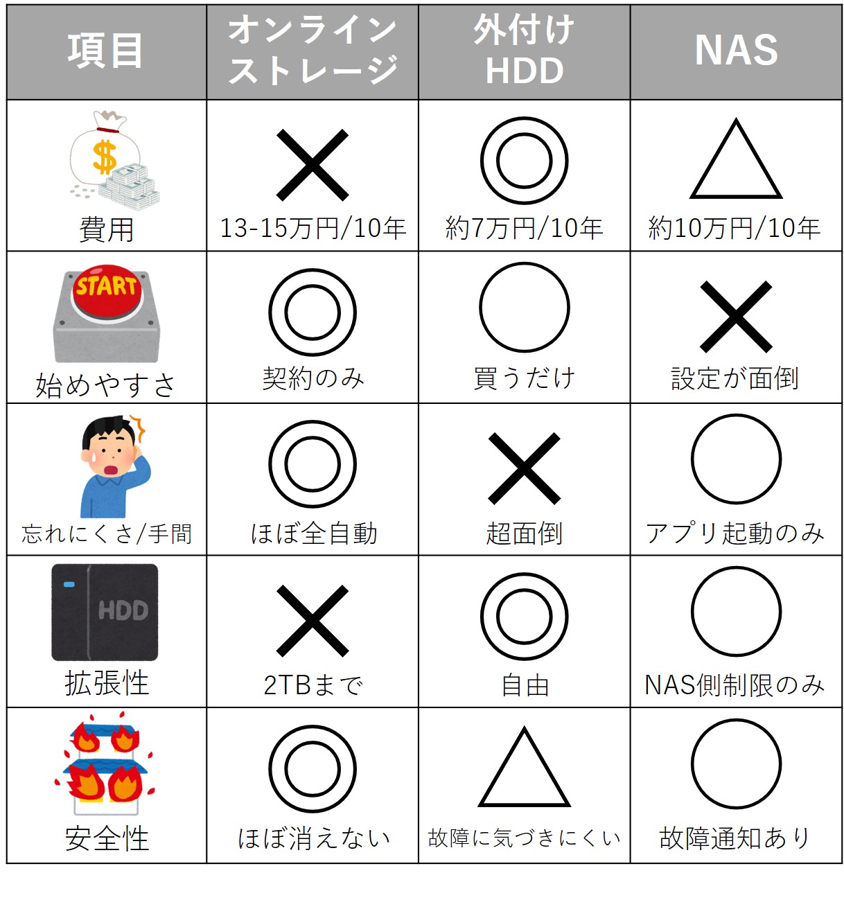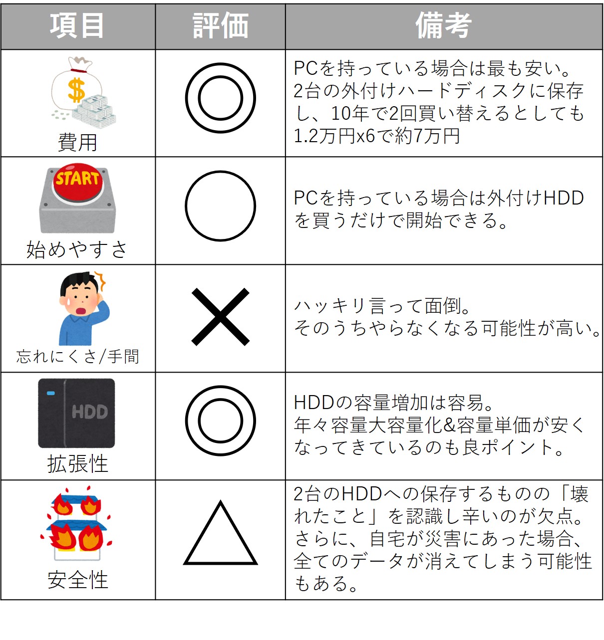 さらに、水害等の天災にも弱く、自宅が災害にあった最悪の場合は全てのデータが消えてしまう可能性があることは頭に入れておいた方が良いです。