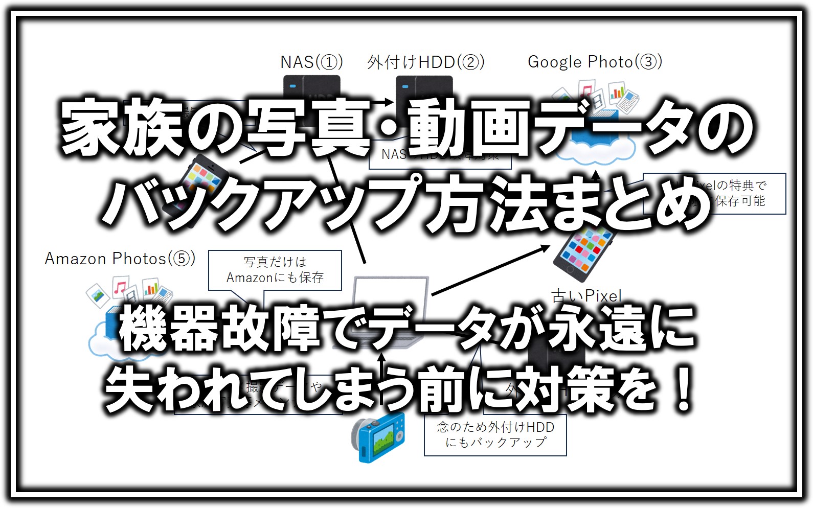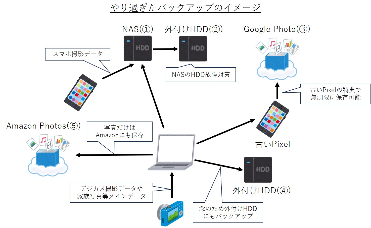 Twitterで先出ししてしまいましたが、私の写真・動画のバックアップ環境は以下のようになっています。