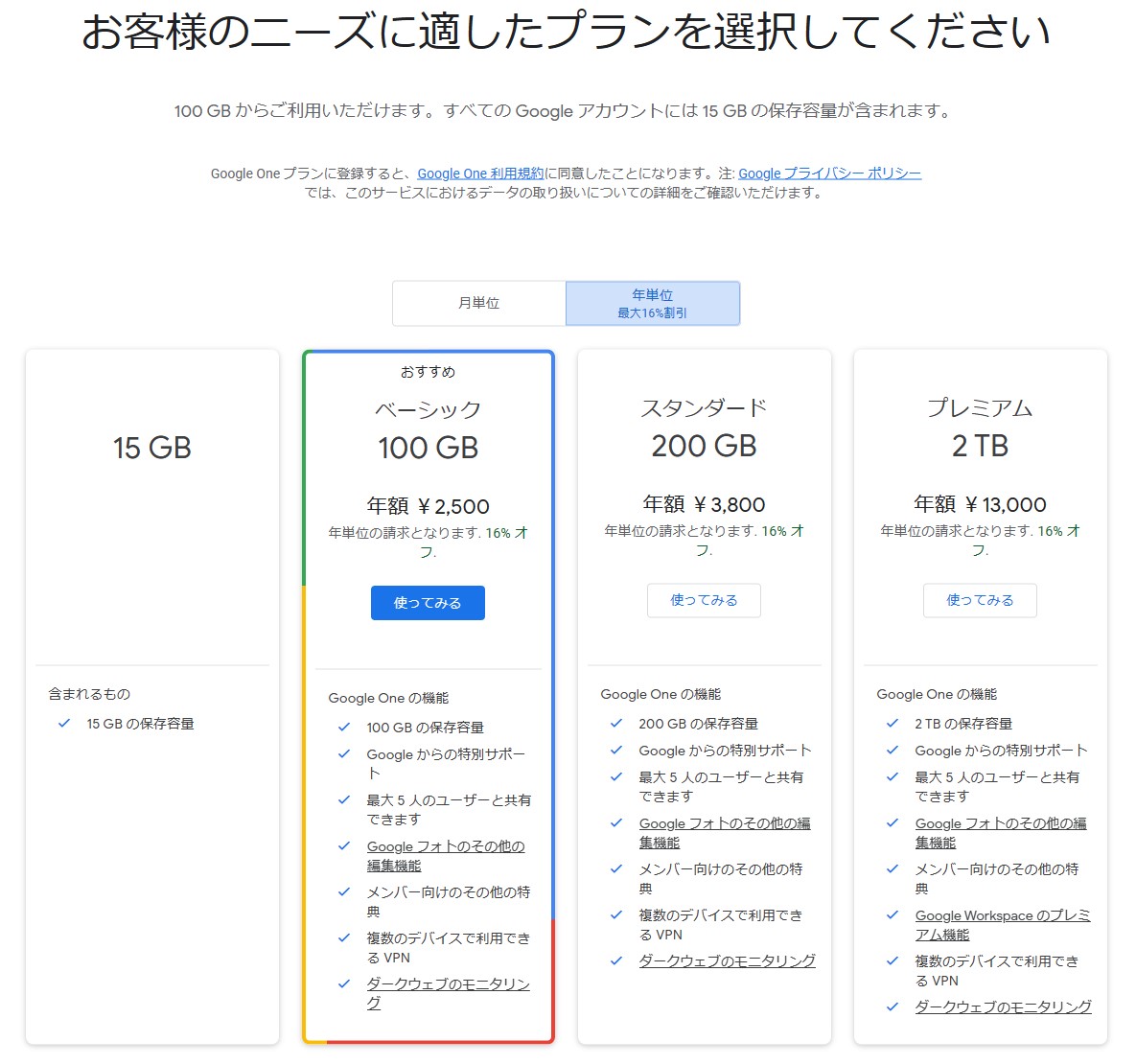 Googleの場合は「GoogleOne」というサービスを使い、100GB/200GB/2TBの3つの容量から選ぶ事になります。