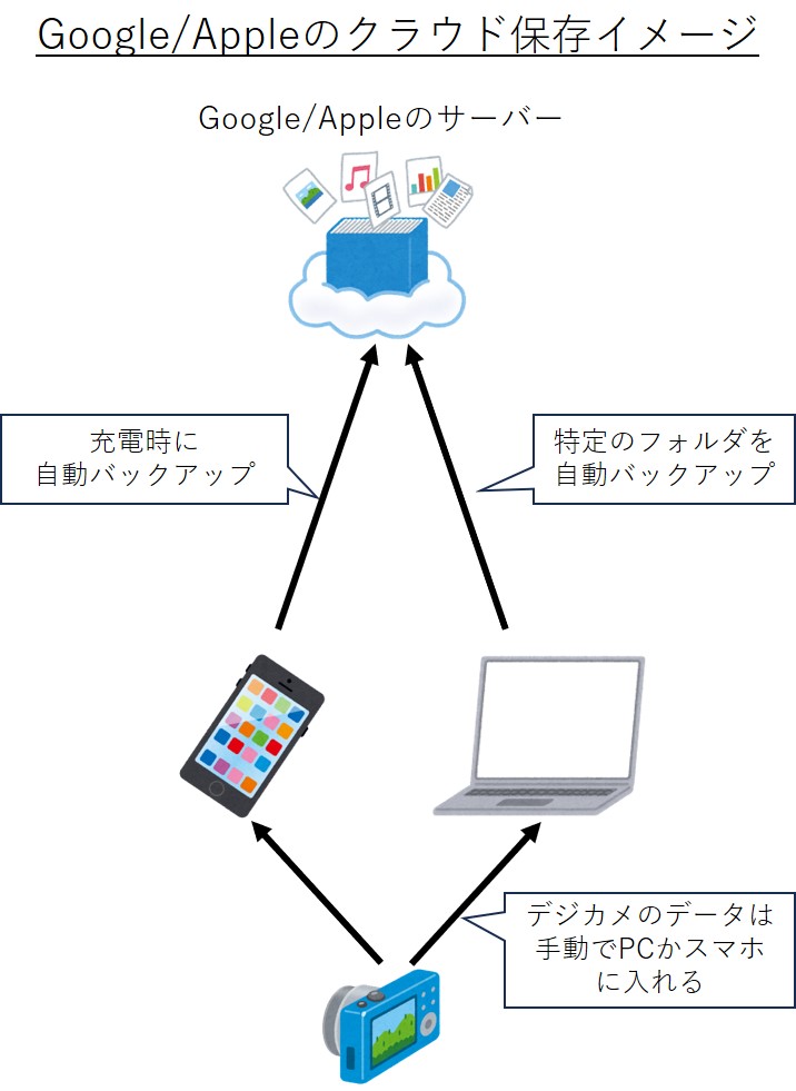 デジカメ利用の場合も、最近のデジカメはWiFi経由でスマホに直接写真を入れる機能が付いている事が多いので、その機能の使ってスマホに写真を入れれば、その写真もバックアップしてくれます。