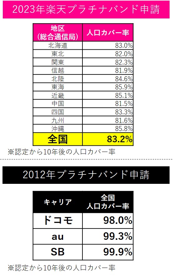- 2012年のプラチナバンド申請の際に各社が約束した人口カバー率