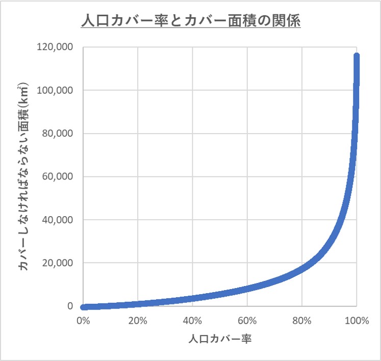 参考として、最も効率的にカバーしたという前提で、人口カバー率とカバー面積の関係を示したものを掲載しておきます。