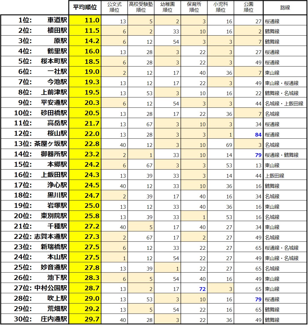 例えば、当サイトでも紹介した大規模マンションが近い志賀本通駅がランクインしていたり、デラデザインで”子育て視点では人を選ぶかも”と書いた今池駅もあります。