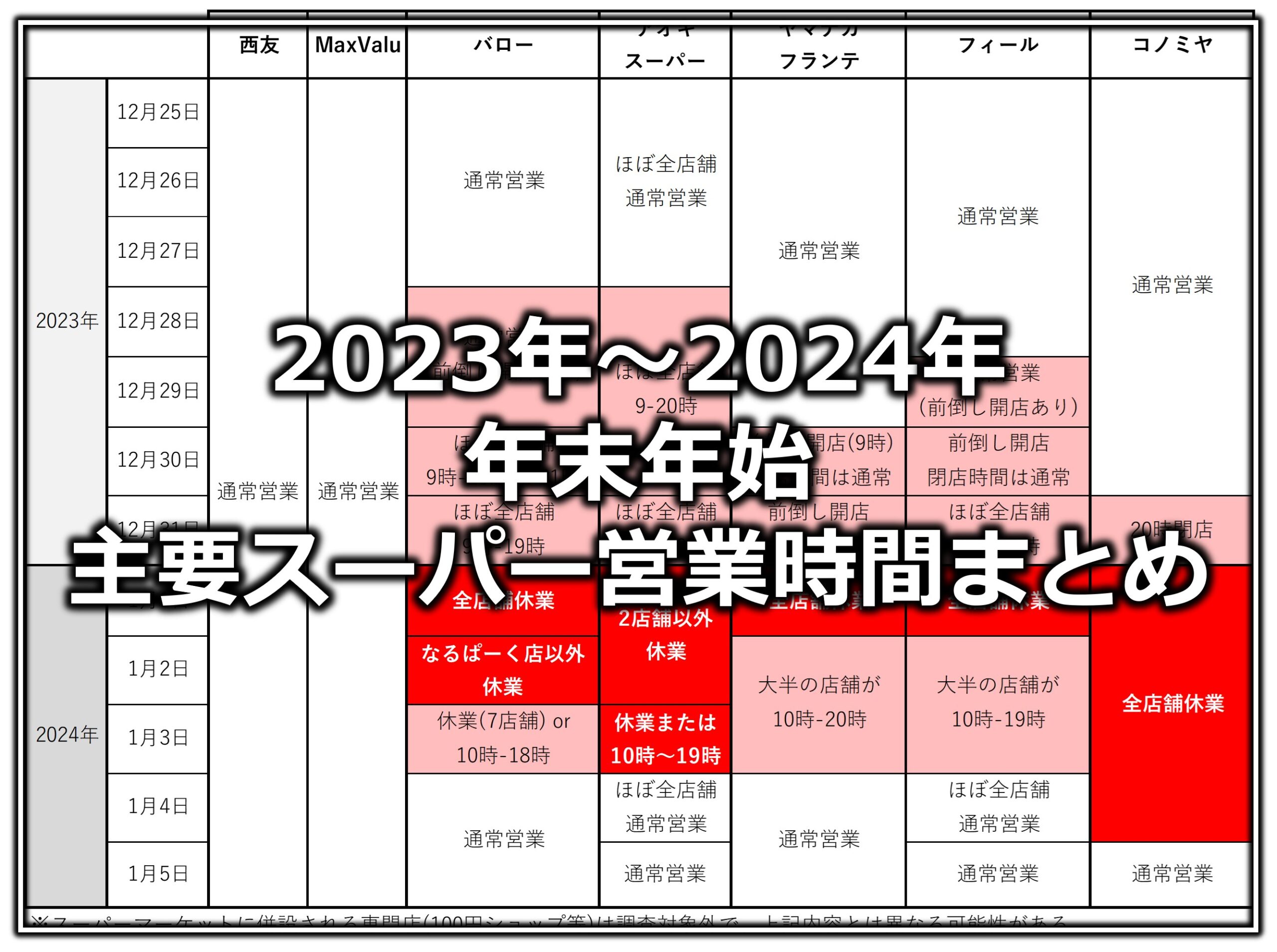 中部地区にあるバローやヤマナカなどの主要スーパーにおける年末年始の営業に関する情報が揃ってきましたので、2023年から2024年にかけての営業状況まとめを作ってみました。