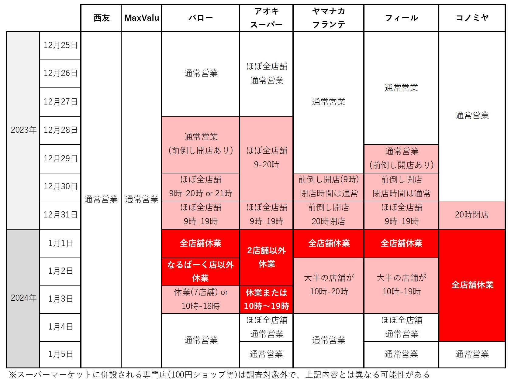 年末年始の主要スーパーの営業状況まとめ(2023年から2024年)