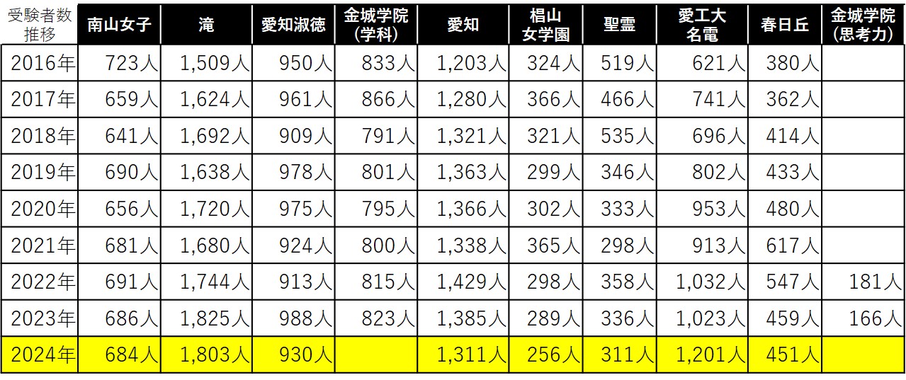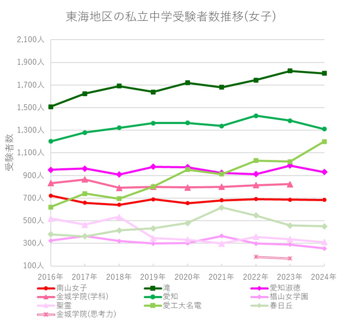 長期で見ても、明確に増加していると断言できるのは名電中以外には滝中だけで、こちらも共学校、つまり、女子校は南山女子といったトップ校でも受験者数を伸ばせていない状況であると言えます。