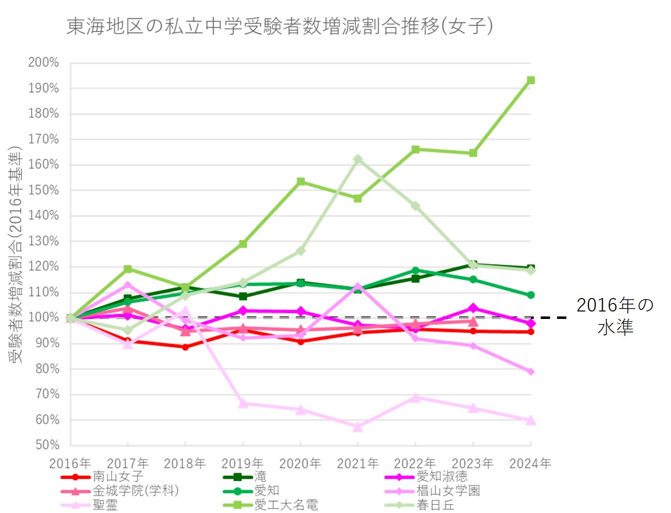上図の通り、2016年の水準(黒い点線)より上にあるのは緑系の色で示した共学校のみで、赤系の色で示した女子校は全て100%未満になっています。
