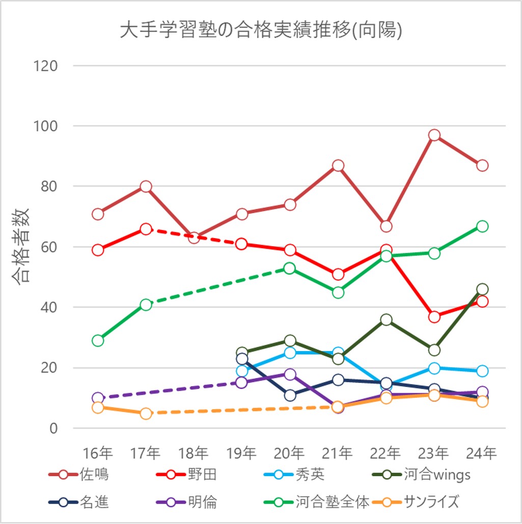 逆に、精力的に教室数を伸ばしている河合塾wings単体の実績はもう少し多くても良いように感じます。