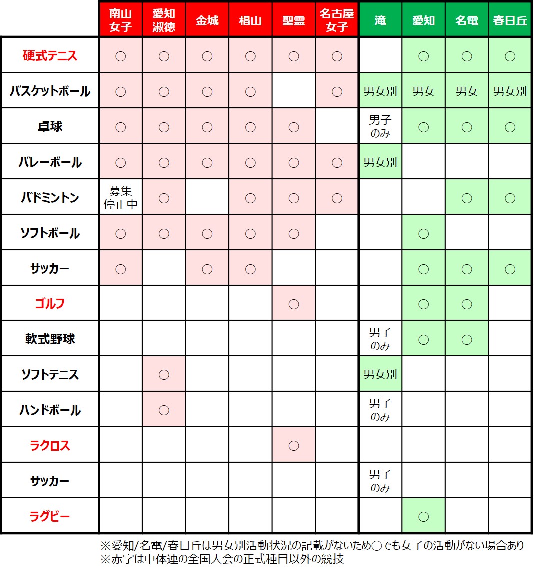 逆に、中体連の統計では上位だったソフトテニスは愛知淑徳と滝のみの採用。
