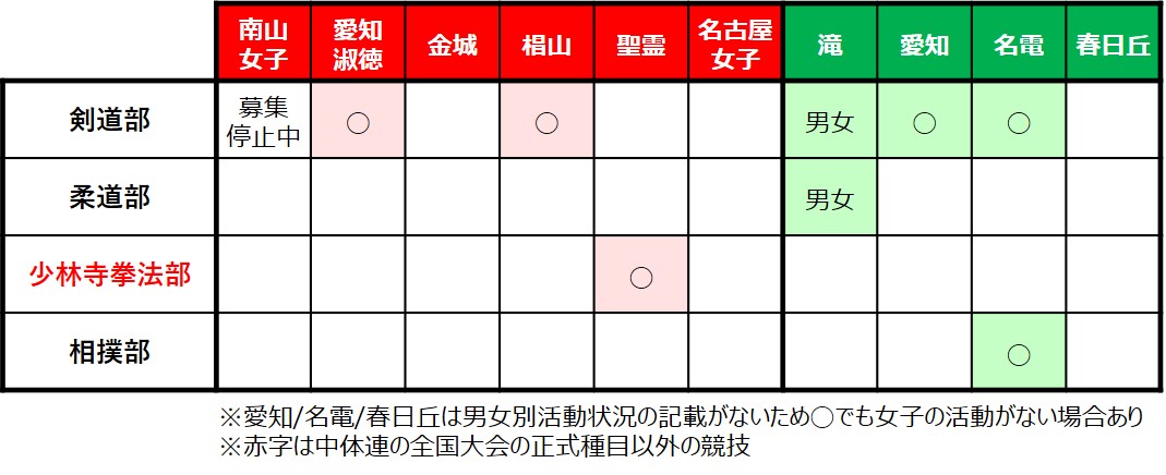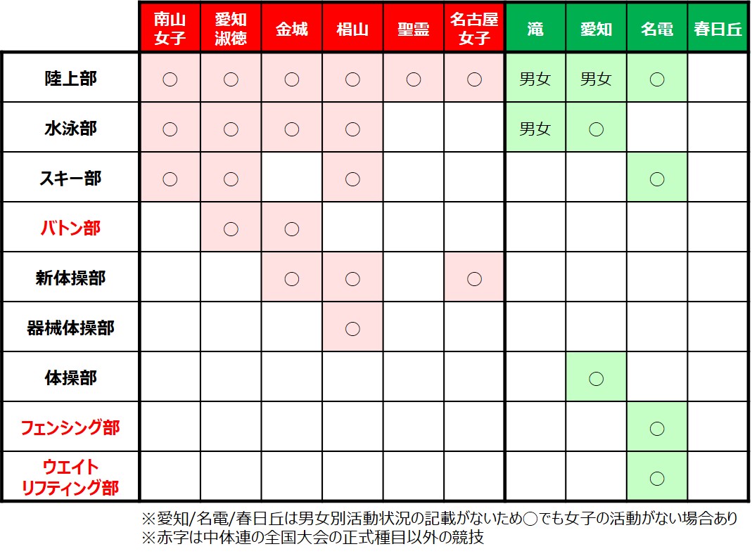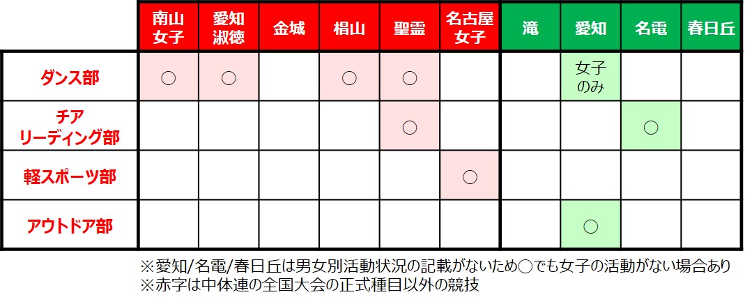 ちなみに、ダンス部は南山女子・聖霊・愛知では運動部、愛知淑徳・椙山では文化部にカテゴライズされていました。