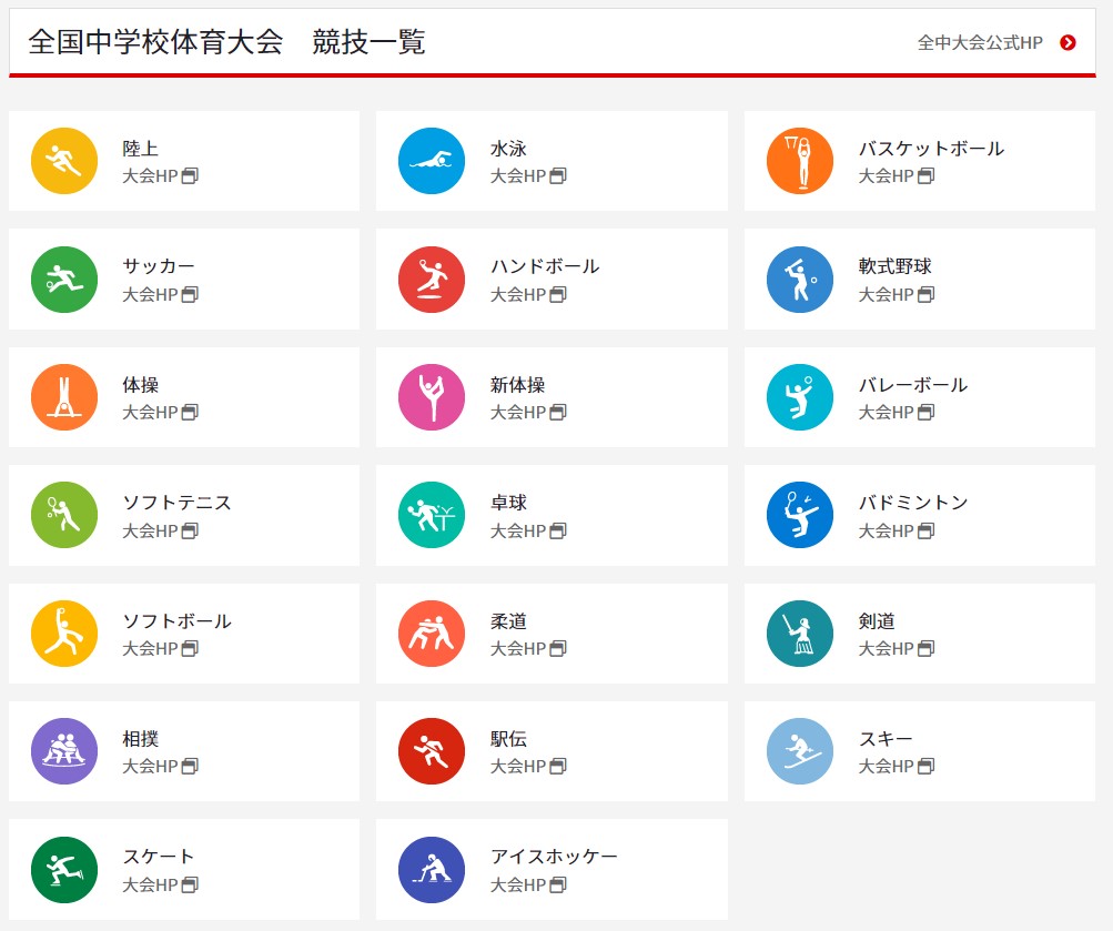 ちなみに、中体連の正式種目とは以下のように中体連が開催している全国大会で採用している以下の種目のことで、中体連の各種統計情報も以下の競技(駅伝以外)が対象になっています。