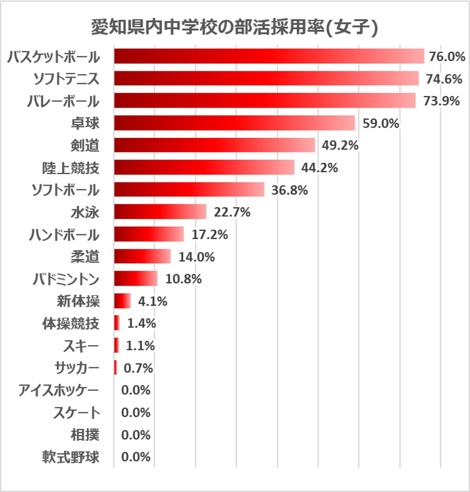 ちなみに、愛知県の中体連加盟校の各競技の部活採用率(女子)は以下の通りとなっています。