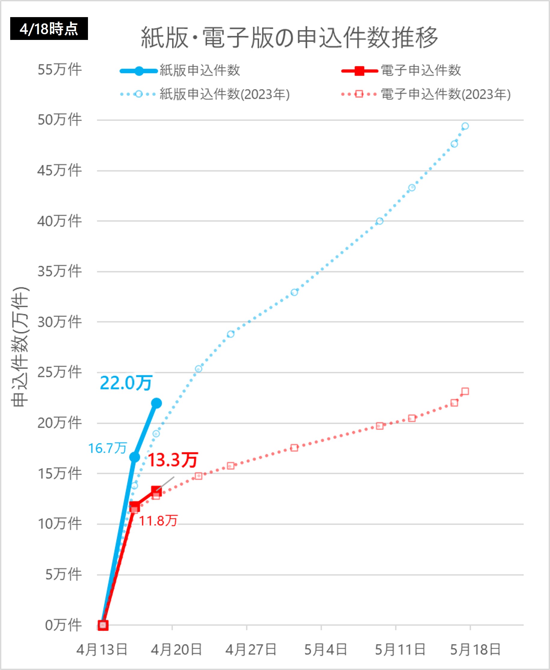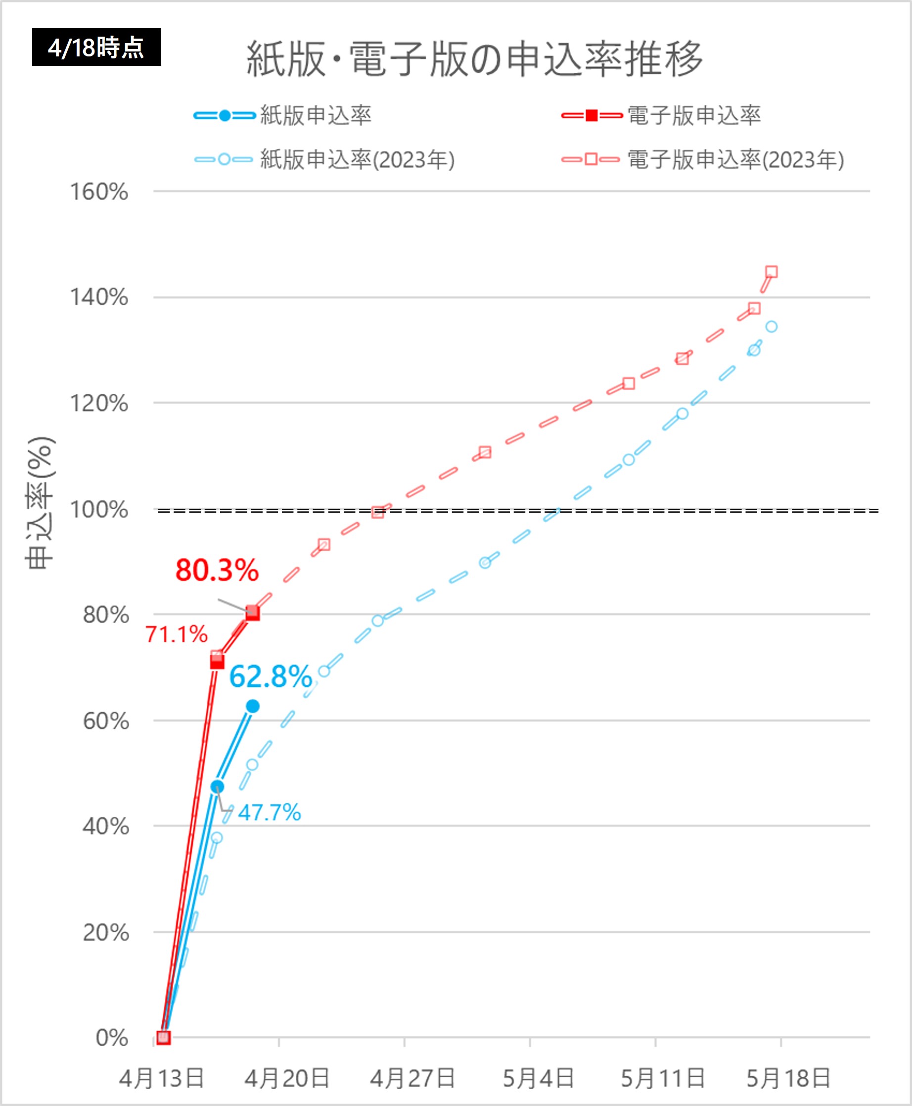 電子版の申込率は昨年同等である一方、相変わらず紙版は昨年よりも上振れしている状況です。