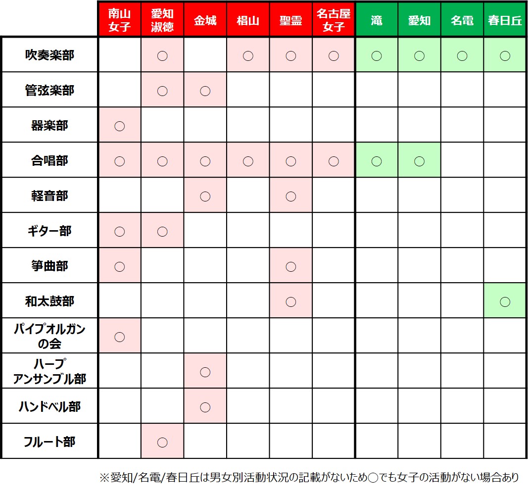 今回ピックアップした全校で何らかの吹奏楽系の部活はあるようです。(愛知淑徳が2種類なければ1つにまとめられたのに…)