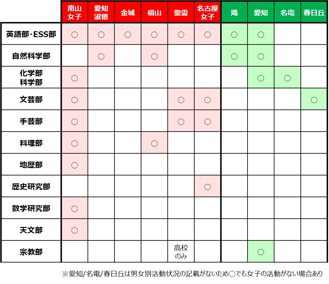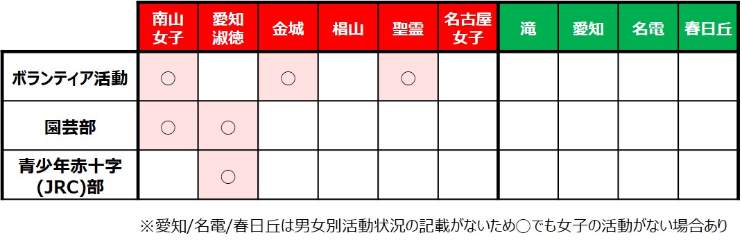 唯一の例外は南山女子で、多くの部活が活動していますね。