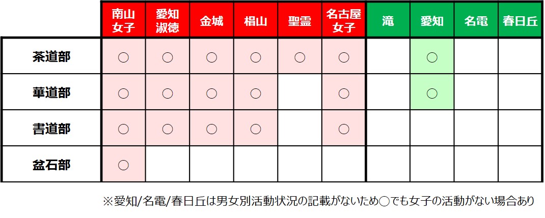 なお、南山女子と愛知では囲碁部と将棋部が1つの部活として活動しており、それぞれ棋道部、囲碁将棋部という名称でした。