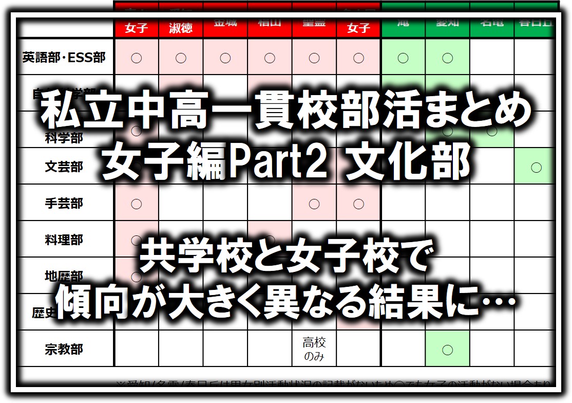 前回から始まった私立中高一貫校の部活まとめ、今回は女子編Part2ということで、女子校+共学校の文化部についてまとめます。