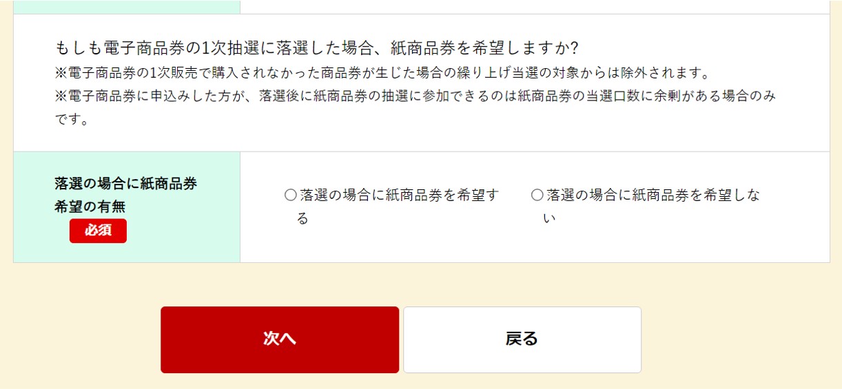→紙版の当選辞退者分の追加抽選に参加する - 落選の場合に紙商品券を希望しない