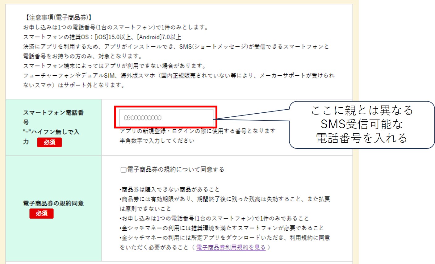 ↓ - 申込フォームにある電話番号入力欄に親とは異なるSMS受信が可能なケータイ電話番号を入れる