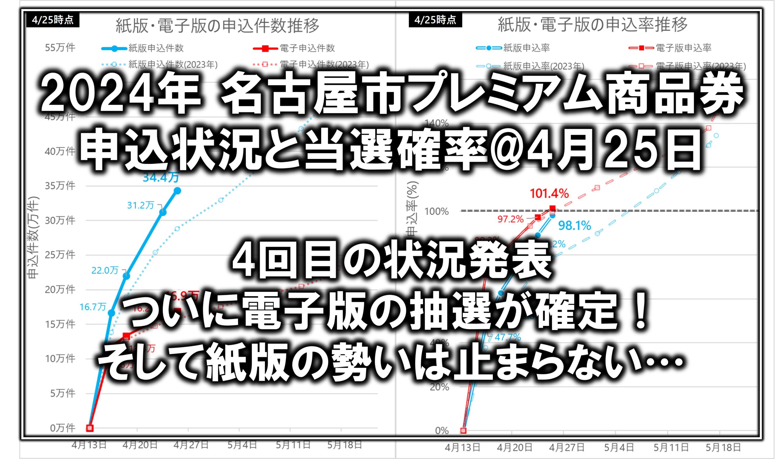 2024年は昨年と比べて紙版の発行数が減った(-5万口)にも関わらず、申し込んだ人は増えているので当然といえば当然ですが、前回発表よりもさらに昨年との差が広がっています。