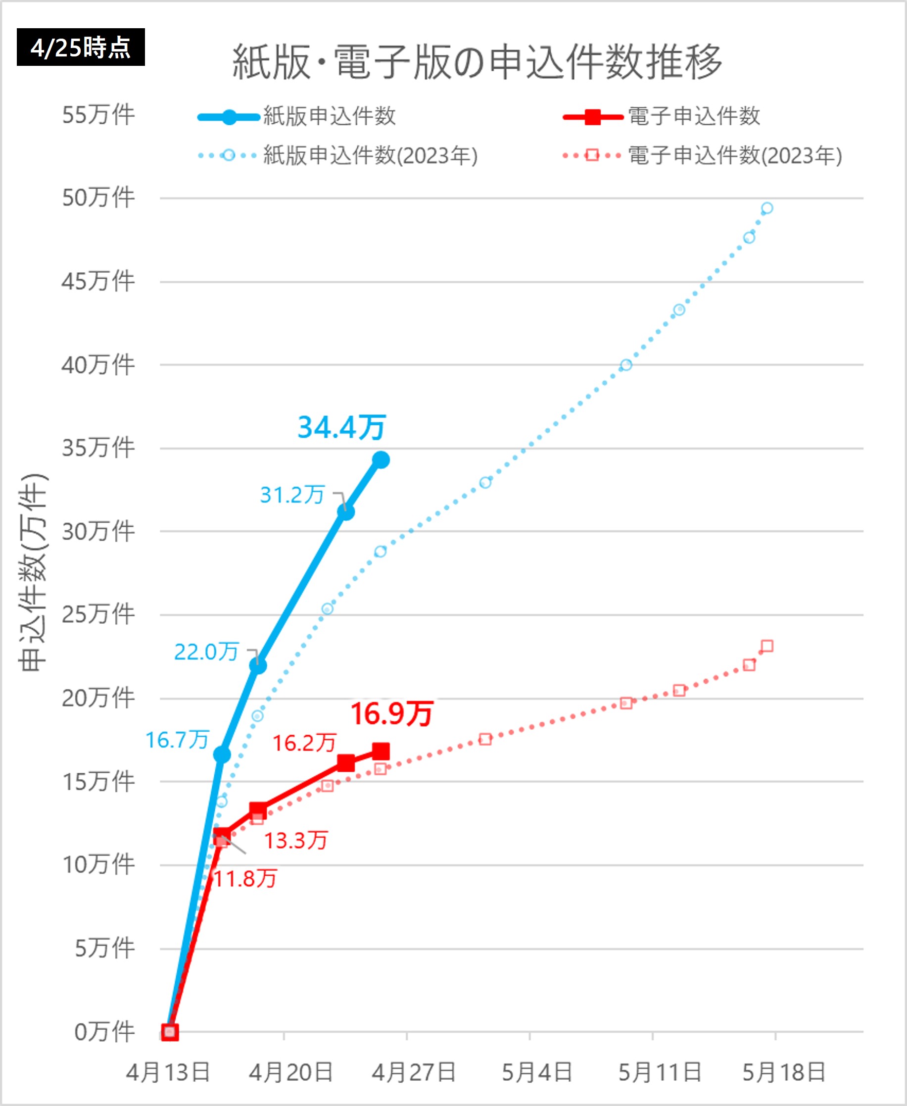 具体的には、昨年同時期の紙版申込み口数が約138万口だったのに対し、今年は約167万口となり、1.2倍に増加しています。