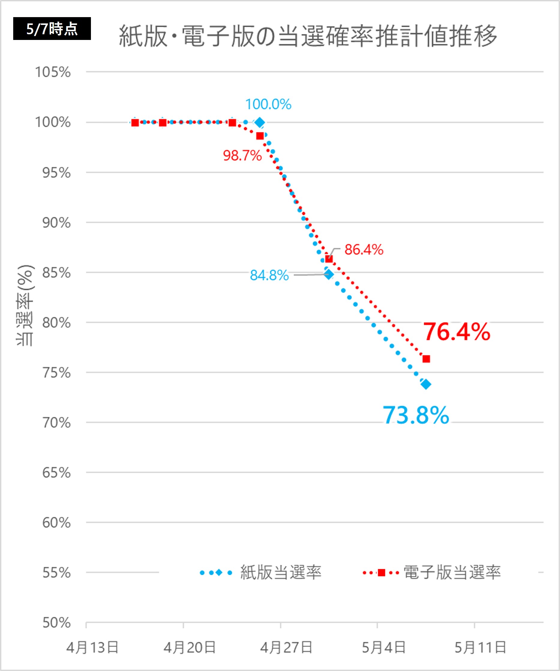 なお、紙版の昨年の当選確率が74.4%だったので、既に紙版は昨年よりも当たりにくい、という状況になっています。
