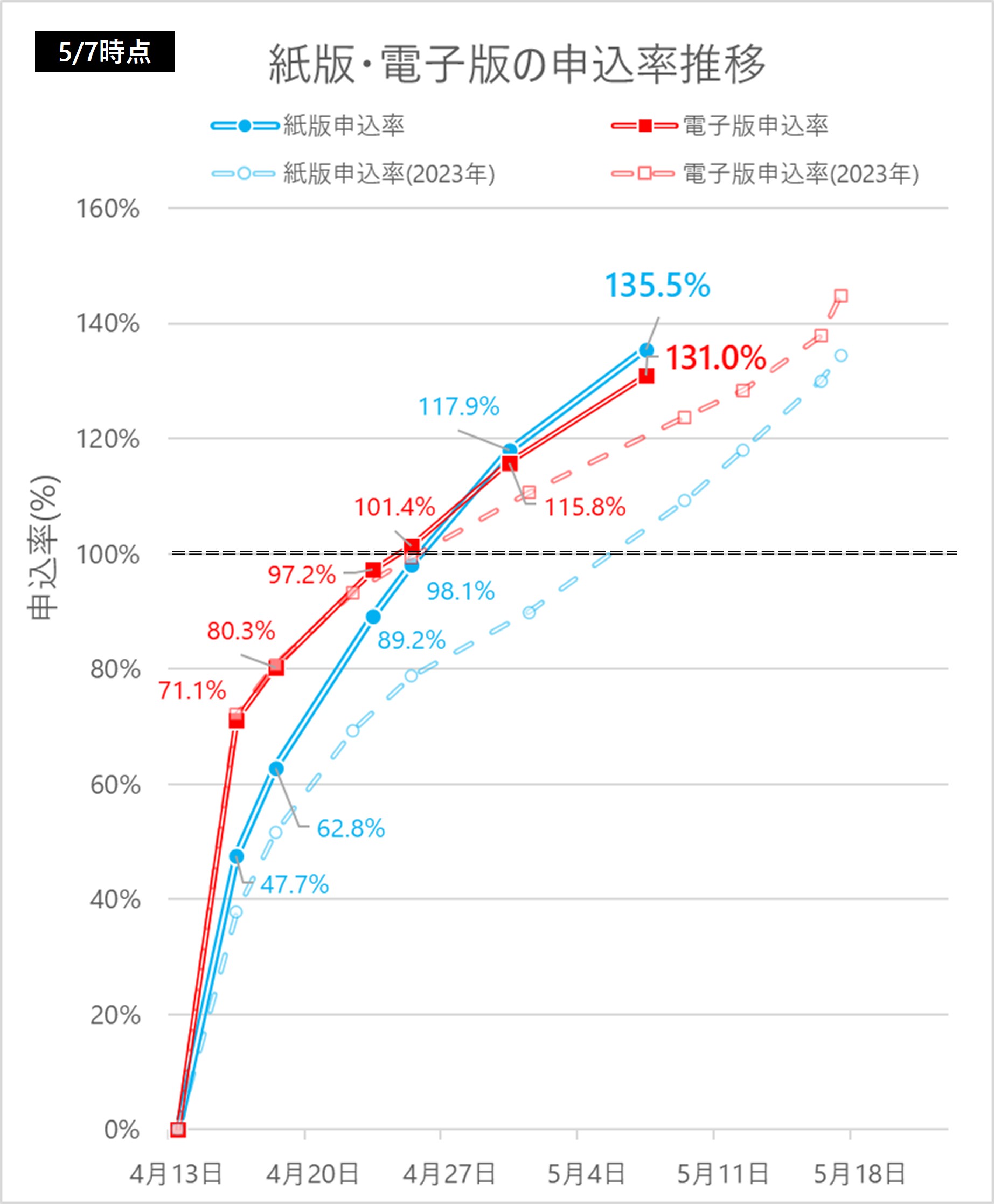 前回は紙版の申込率(倍率)が電子版を超えましたが、GWを挟んでどうなったのでしょうか。