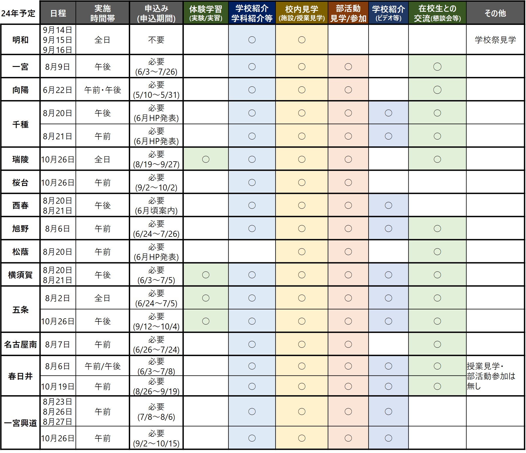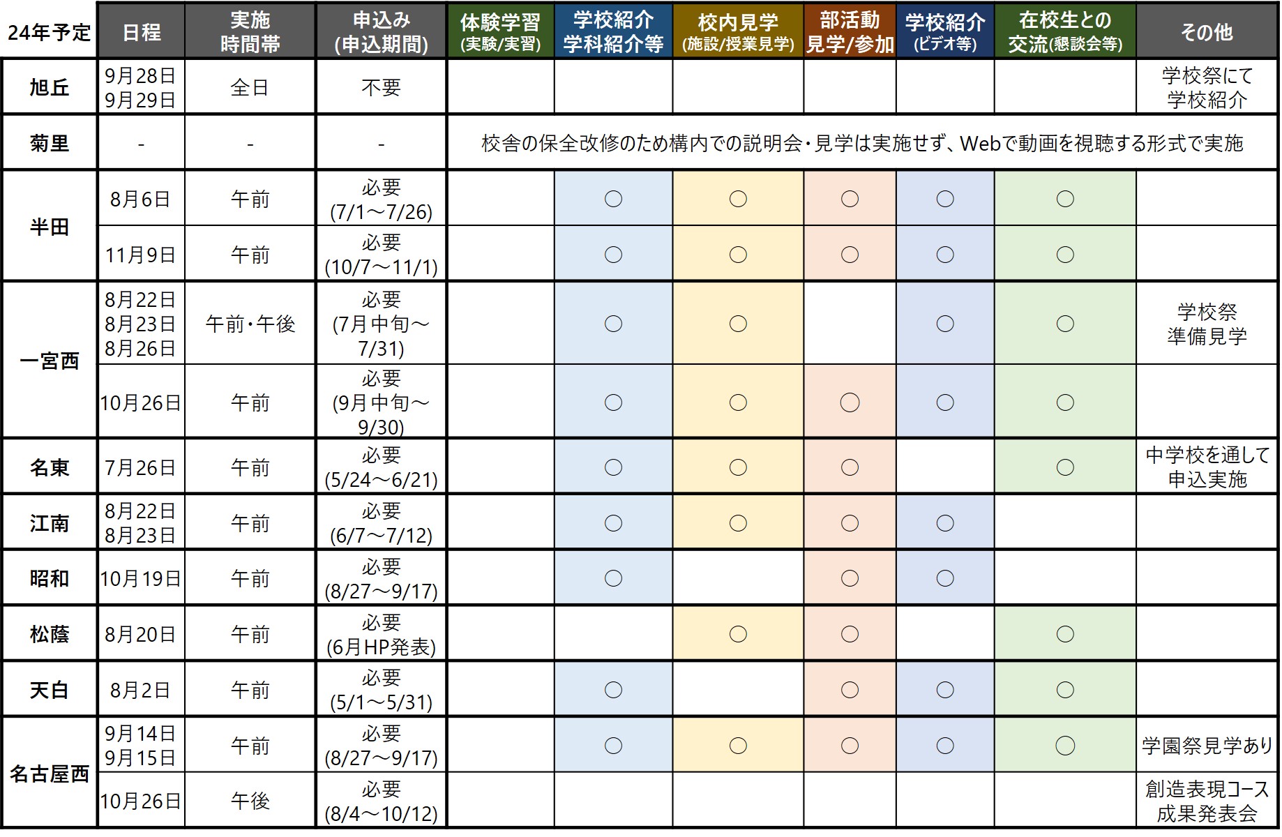 尾張1群の学校の学校見学会・体験入学スケジュールは以下の通りです。