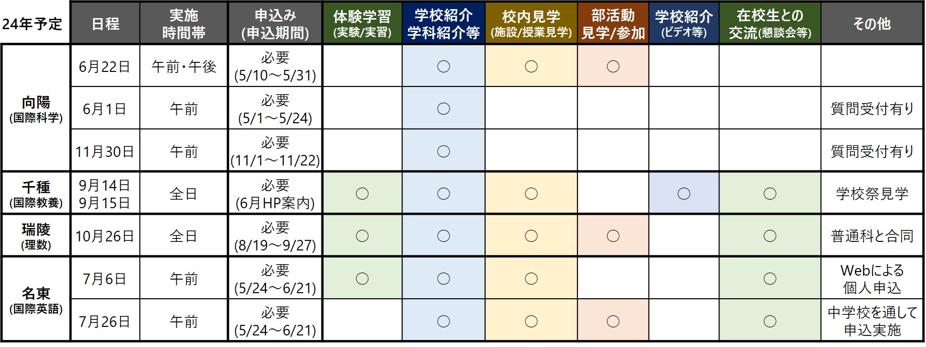 また、最近人気の向陽高校は毎年締切が早く、普通科のイベントは5月末までに申込が必要なので注意しましょう。