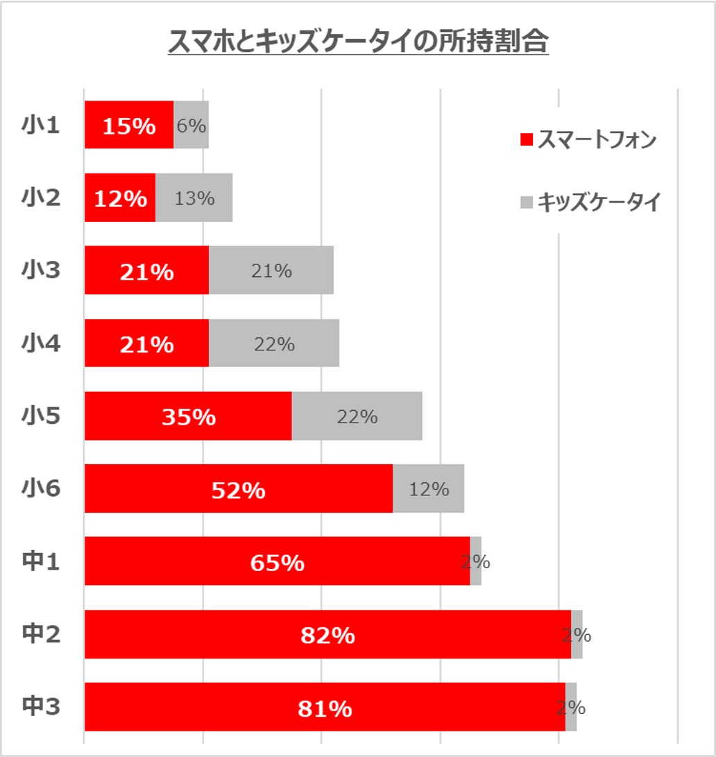 モバイル社会研究所が行った2022年の調査によると、小学生のスマホ所有率は小6では50%を超え、中2以降は80%を超えます。