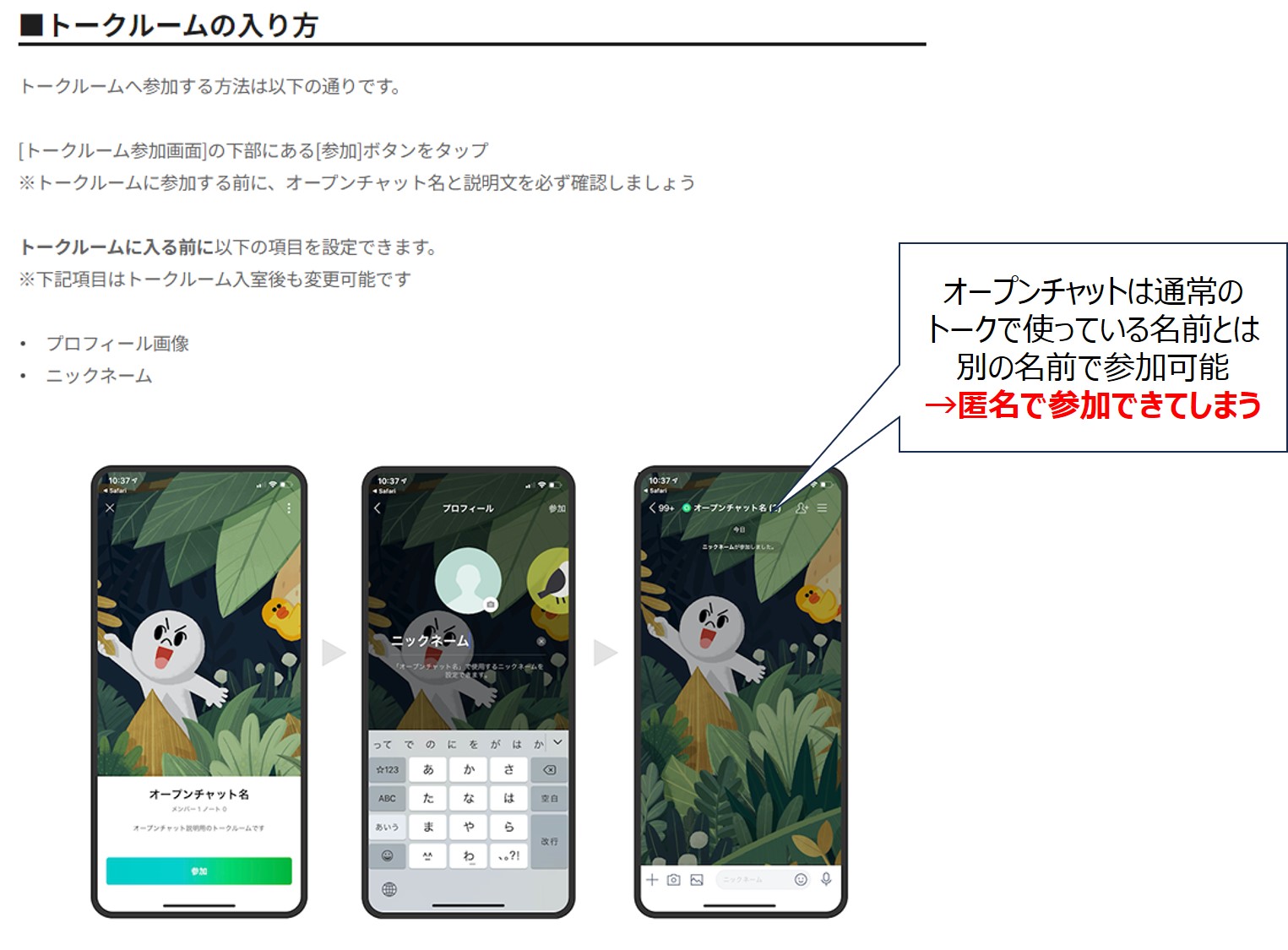 また、オープンチャットは匿名が基本のため、精神的に成熟していない小学生には向いていません。