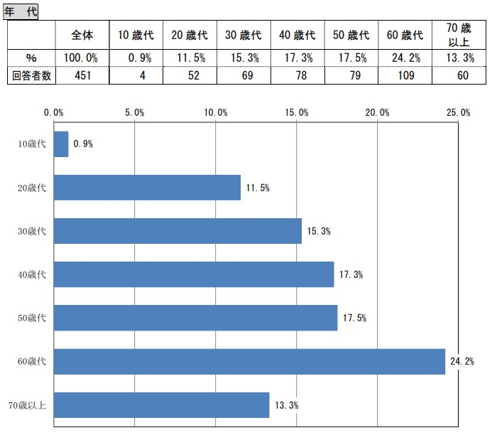 なお、この方向性を検討するにあたって活用された可能性の高い市民アンケートは、令和2年のネットモニターアンケート調査によるものですが、アンケート対象の年齢構成は以下のようになっています。