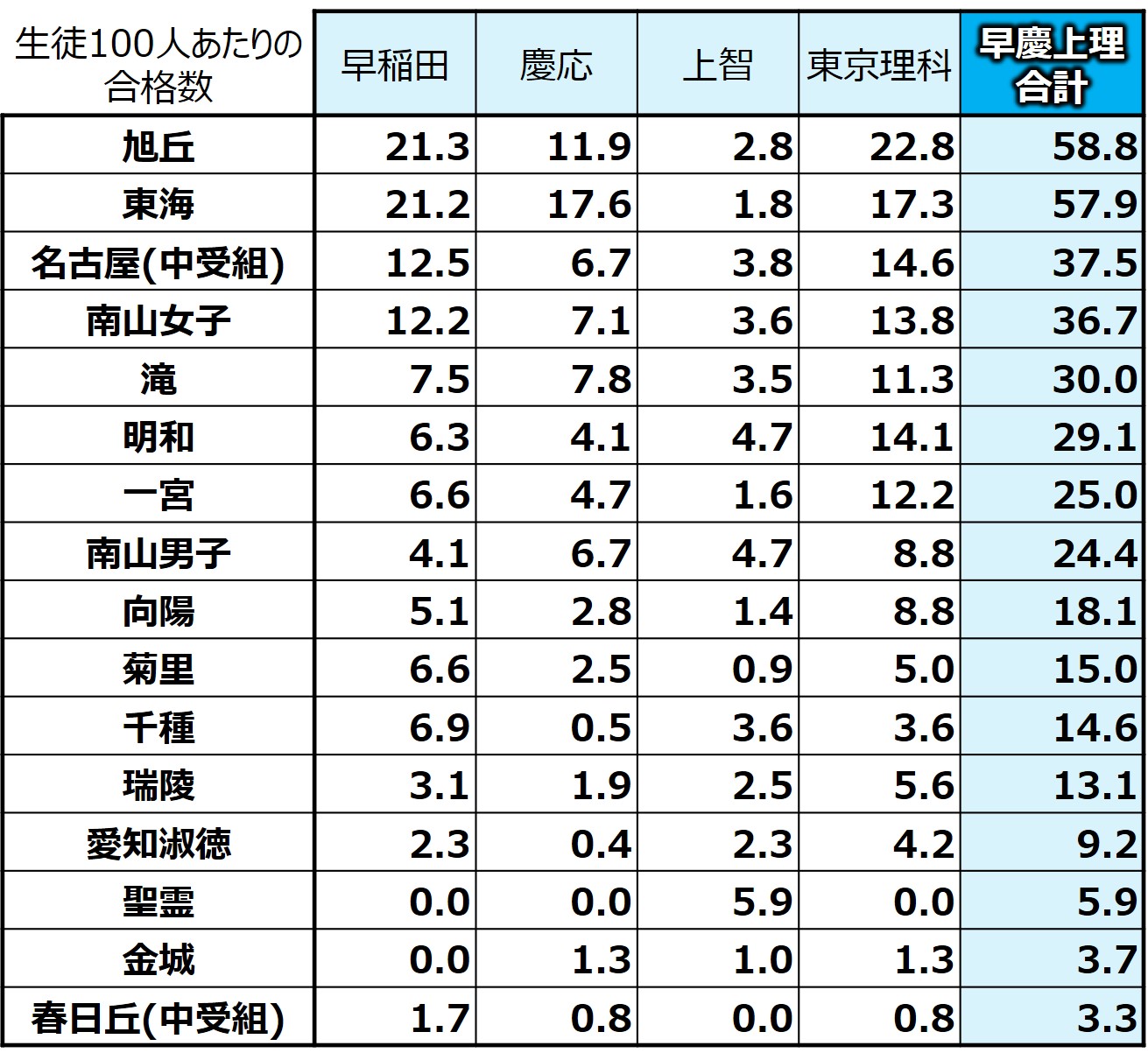 早慶上理は好調だった旭丘が全体トップで、東海中が僅差で2位に入っており、この2校が頭一つ抜けています。