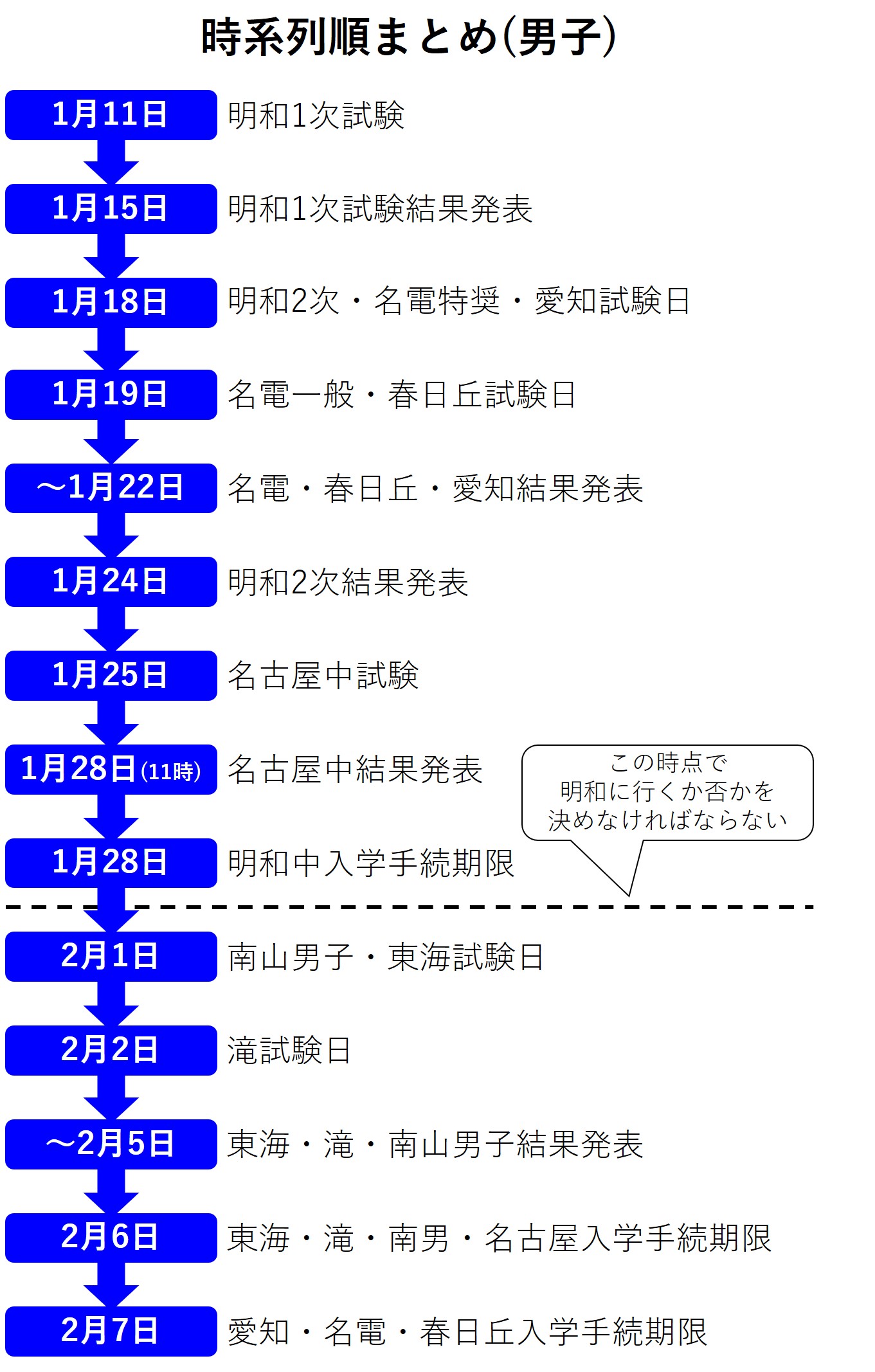 これは、南山男子・東海・滝の3校は合格発表が2月4日・5日に行われますが、明和中の入学手続き期限は1月28日であるためです。