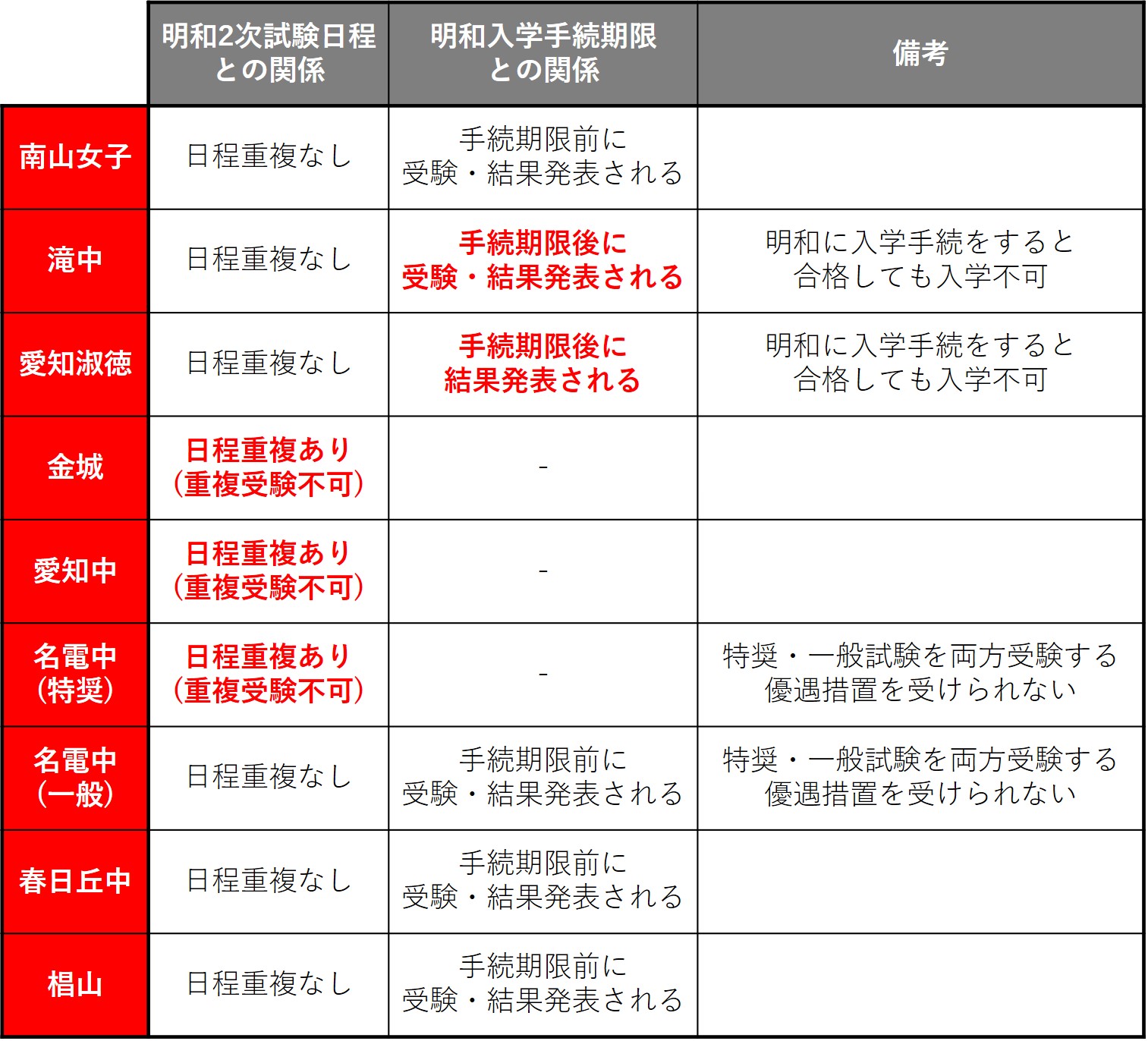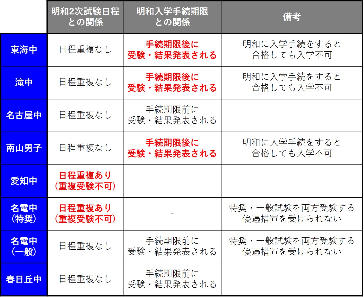 これは、2025年のスケジュールでは東海・滝・愛知淑徳・南山男子の4校の合格発表が明和の入学手続き(=入学確約書の提出)以後にあるためです。