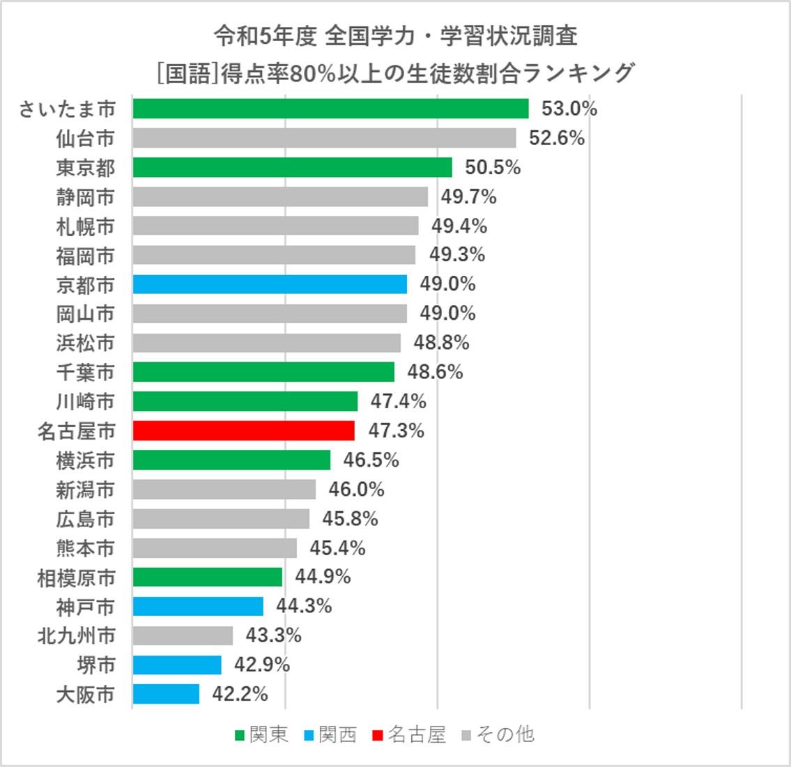 上記の通り、全体感としては、名古屋市の国語の学力は政令指定都市でも下位に来ています。