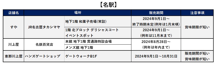 「川上屋」はすやとは異なり、名古屋に常設店舗はなく、栗きんとん販売期間中のみ臨時店舗が名鉄百貨店に出される形になります。