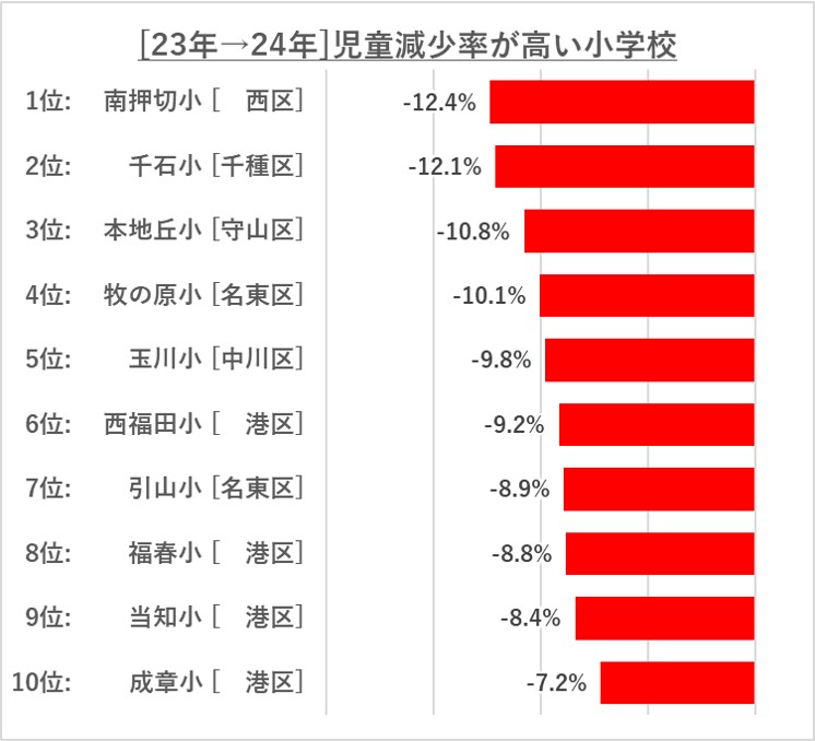 その他、増加率の高い学区は基本的に郊外が多いのですが、都心部にある程度近い鶴舞小や老松小も入ってきています。