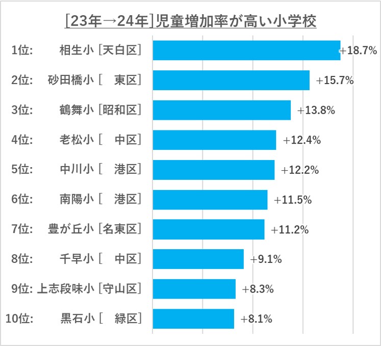 増加率トップは天白区の相生小で、なんと2割弱も増えています。