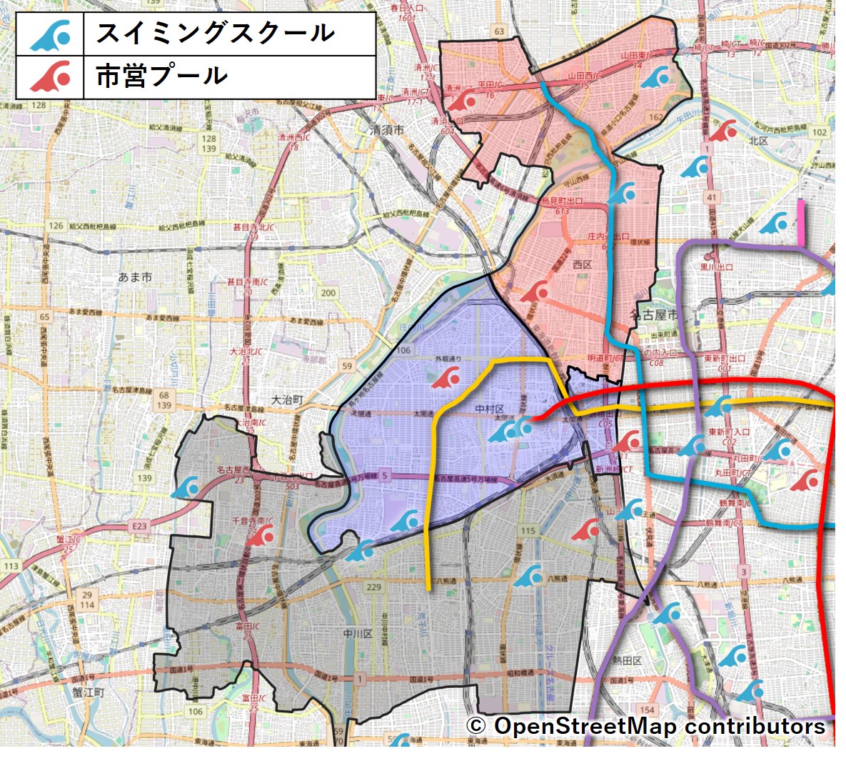 西区・中村区・中川区のスイミングスクール・市営プールの状況は以下の通り。