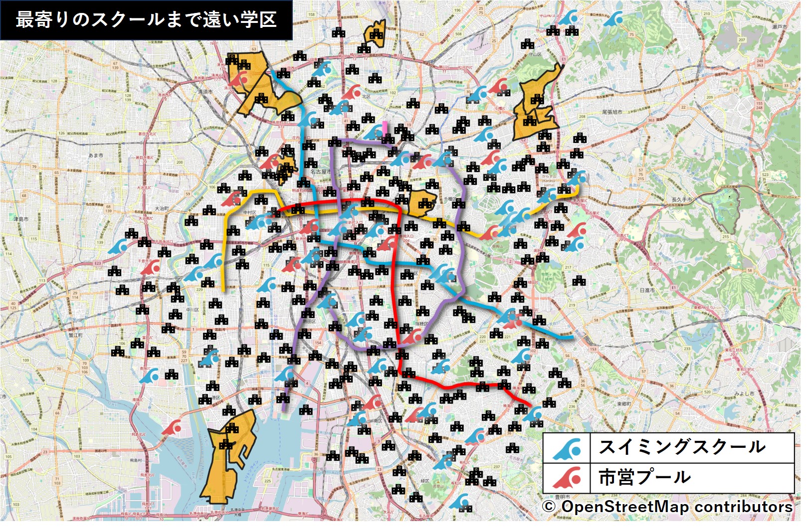 繰り返しになりますが、名古屋市の境界に近い学校は市外のスイミングスクールが近い可能性があるので北東、北西の学区は実際にはもっと近くにスイミングスクールがあるかもしれません。