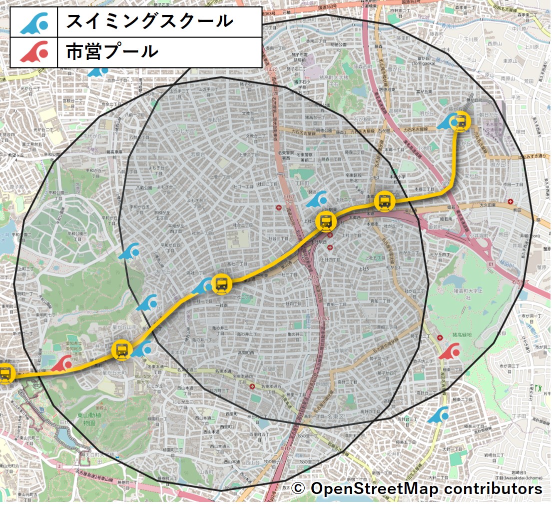 以下の地図はトップの施設数である上社駅・一社駅周辺の様子ですが、特に一社駅周辺には駅の近くにスイミングスクールが多く、恵まれた環境だと言えます。