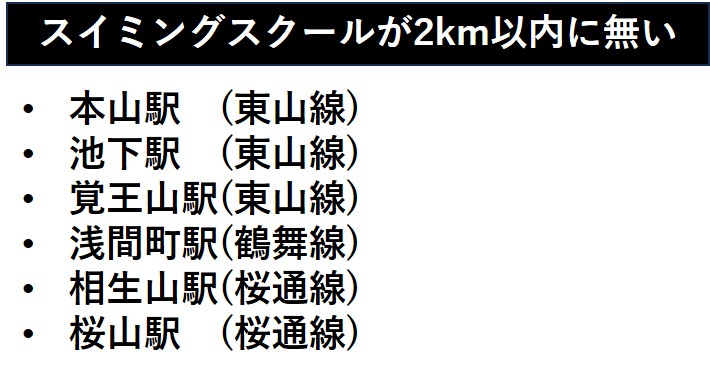 逆に、半径2km以内にスイミングスクールが無い駅は以下の通りでした。