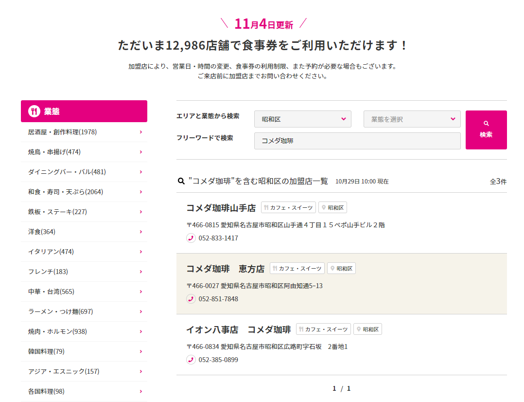 例えばコメダ珈琲の場合、上記URLにアクセスし、エリアを選択して「フリーワードで検索」の右に「コメダ珈琲」と入れて検索するだけで出てきます。